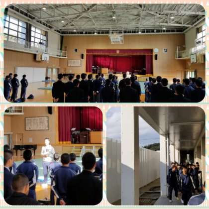 創立祭・学習発表会を控え、体育館の前半分にはシートが敷かれた状態です。いつも違った雰囲気に少し落ち着きがなく、切り替えが遅いと指導されていました。