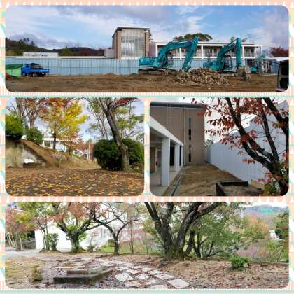 教育棟の北側では、秋の深まりが見られますが、南側では新たに白いフェンスが張り巡らされ一階教室前は圧迫感があります。