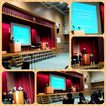 各クラス代表によるスピーチでは、夢のような将来像を持っている生徒やユニークな生き方を求める人生設計など、英語で語るその内容に会場は大笑い。