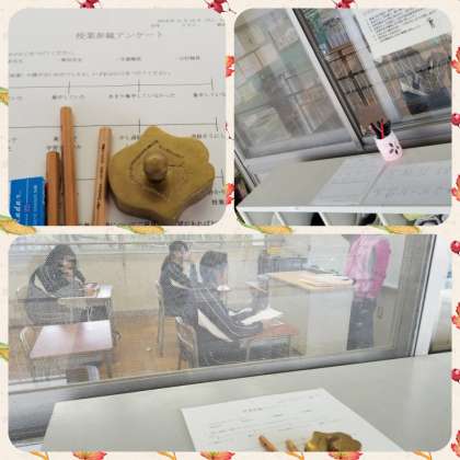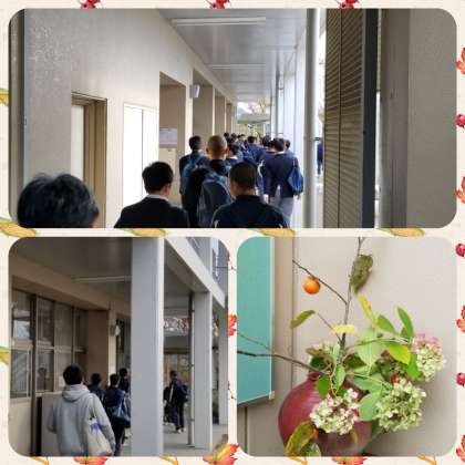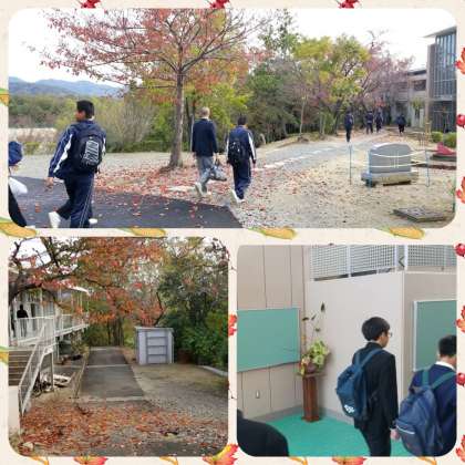 朝礼を終え教室へ向かう道は、紅葉した木々と常緑樹、そして落葉した葉でとても情緒があります。
