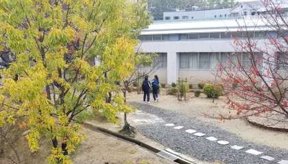 生徒が登校する時間帯は、雨が止み仲良く談笑しながら女子が玄関をくぐります。