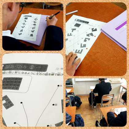 スタートの合図で図形を選び、線で結んでいきます。左右と天地が逆転した図がたくさんあり頭を悩ませます。できた人から手を挙げタイムを記録します。個々のファイルには過去の記録が残っており、比較できるようになっています。
