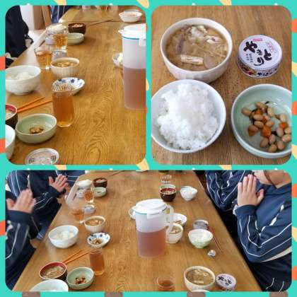 今日の昼食は、豚汁・昆布豆・焼き鳥缶です。