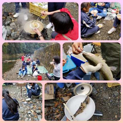 魚の芳ばしさと豚汁の味噌の香りが河原に漂い、食欲をそそります。