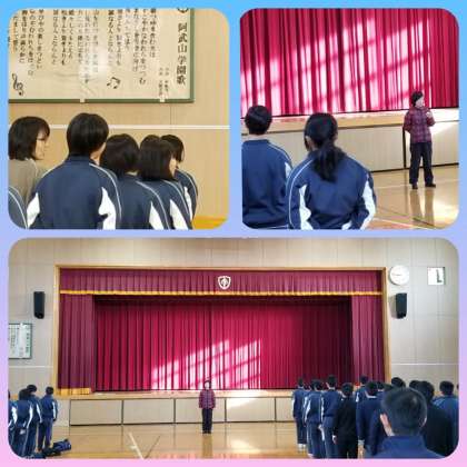 朝礼が火曜日だけになったので、学園歌をテープで歌いました。