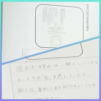 『響く』・・・「頑張りは一番身近な人が分かっている」と言われたことが心に響いて、がんばろうと思う自分に大きな影響を与えるきっかけになったので、この漢字を書きました、となかなか生徒もよく考えています。感心しました。
