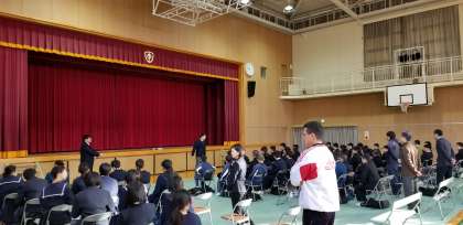 体育館に集合し、集会担当から諸連絡等、お話がありました。このあと、終業式を体育館で行ないます。