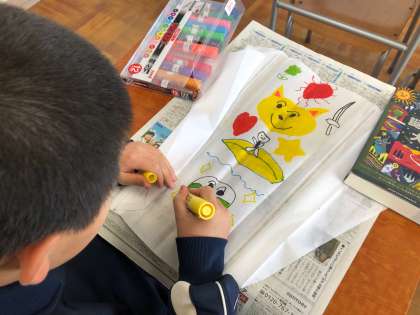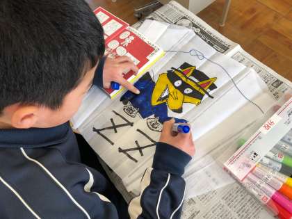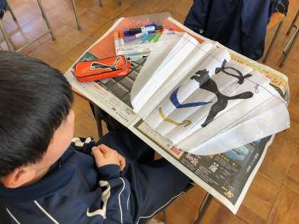 今日は時間いっぱい使って、凧にイラストを描いていましたが、どの児童も今日の内に描き終え、来週の図工の時間に運動場で凧揚げを行う予定とのことです。