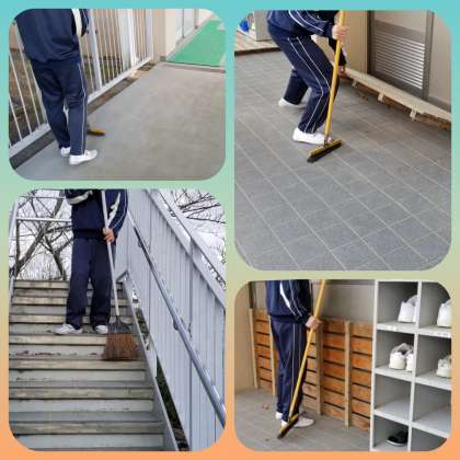 この季節は、風が強く、廊下の掃き清掃はたいへん。小まめに集め処理するのが効率的でしょうね。また水が冷たく、雑巾を洗うのが辛い。