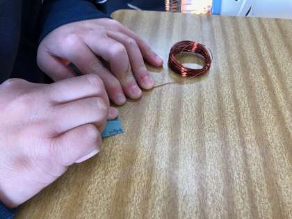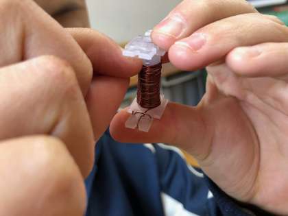 それに伴い、先週から各自配布された実験セットを使い、これから実験するにあたっての準備物として、100回巻きのコイル作りに取り組んでいました。