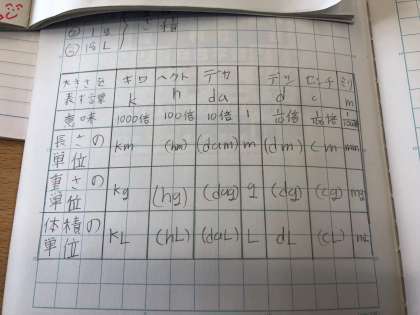 その後、長さ・重さ・体積の単位について表にまとめ、ノートに表を書いていましたが、きちんと定規を使って、きれいに作り上げていました。