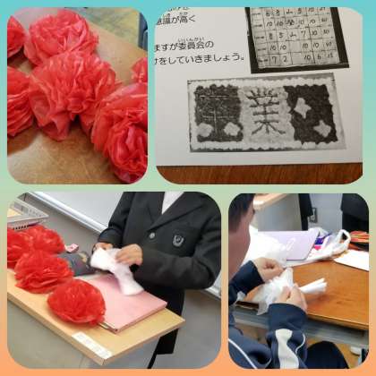 後半は、お別れ会に向けての準備に取りかかっていました。看板の縁取り用のお花づくりに夢中になっていました。