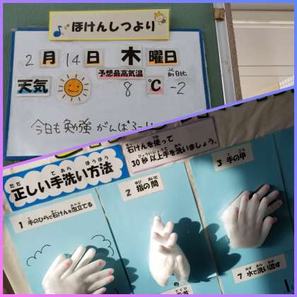 委員会生徒が作成した廊下のポスターでは、2月12日(火)〜15日(金)までは、手洗い週間となっています。