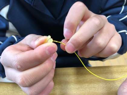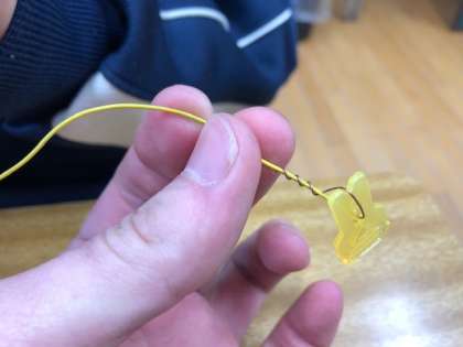 「プラグ導線を作ろう」ということで、ビニール導線と接続プラグを組み合わせて作り上げていました。