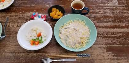 ツナとコーンのクリームスパゲッティに温野菜サラダとミカンの缶詰めでした。