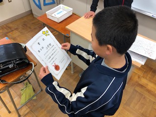 小学部の教室を朝訪れると、先日行われたレクリエーション大会の賞状を受け取っていました。