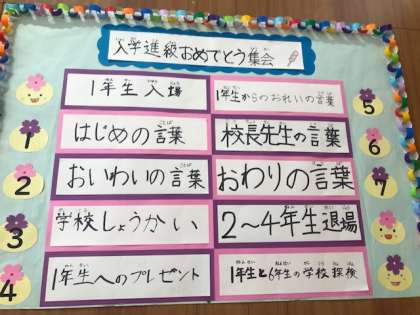 今年のめあては「新しい学年で楽しく笑顔でスタートできる入学進級おめでとう集会にしよう」でした。