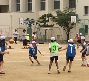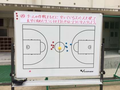 バスケットボール(ボール運動)での研究授業をしました。チームの勝利のために、どのように攻めたり守ったりしたらいいのか、チームで話し合いながら、練習や試合にのぞみました。