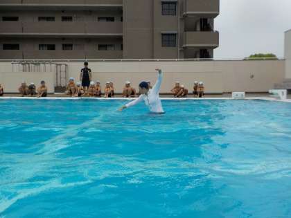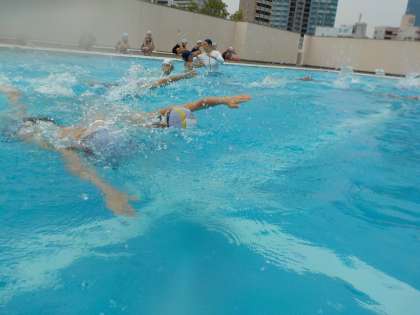 今回は,5年生と6年生にクロールの泳ぎ方の指導をしていただきました。泳ぐときの呼吸の仕方や腕の使い方,息継ぎの仕方などを,わかりやすく丁寧に指導していただきました。千葉すずさんの指導を受けて子どもたちは,ぐんぐん泳ぎが上達しました。