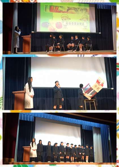 今日の児童集会は,給食委員会の発表でした。最初に,給食調理員さんに感謝の気持ちを込めて感謝状と各クラスで作った給食カレンダーを渡しました。