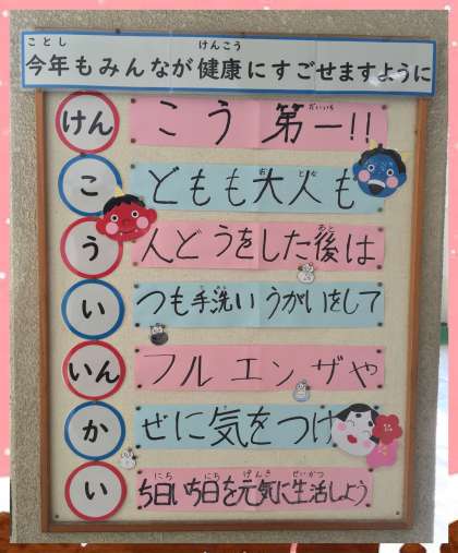 保健室前の掲示が新しくなっていました。「あいうえお作文」の健康委員会バージョンのようです。縦に読むと,けんこういいんかい。横に読むと,健康を願う文章になっています。