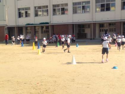 大阪市の体力づくりモデル校の一貫で、体力づくりアクションプランというものがあります。11月10日(月)、元サッカー日本代表の堀井氏と森島氏が来校。子ども達に基本となる運動のトレーニングを教えてくださいました。