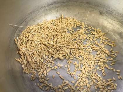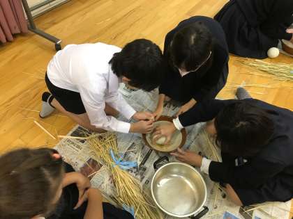 10月8・9日に以前収穫した稲の脱穀と籾摺り(もみすり)をしました。脱穀は割り箸を使って「もみ」を一つひとつ取っていきました。そのあと籾摺りをしました。すり鉢を使って「もみ」から「玄米」にしていきましたが、なかなかもみ殻が取れず、とても苦労しました。1時間みんなで行い、玄米1合分といったところでしょうか。また一つ昔の人たちの苦労を実感することができました。