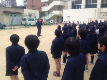 1月16日(金)午前10時40分から、地震と津波を想定した避難訓練を実施しました。休憩時間だったので、運動場で遊んでいた子どもたちは、中心に集まりしゃがみました。そのあと、運動場南側に整列し、人数確認をしました。さらに、津波警報が発令されたという、想定で3階の教室に順次避難をしました。