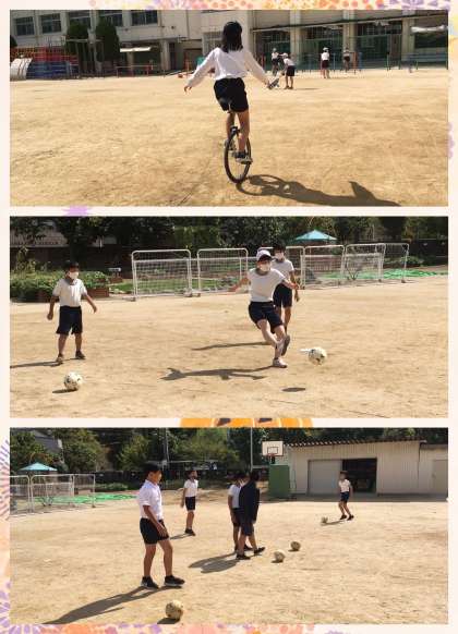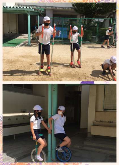 竹馬や一輪車,ボール投げなどにチャレンジしていました。