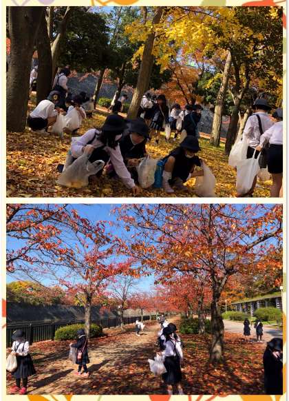 イチョウの葉や桜の葉のきれいなじゅうたんを歩きながら落ち葉を拾いました。