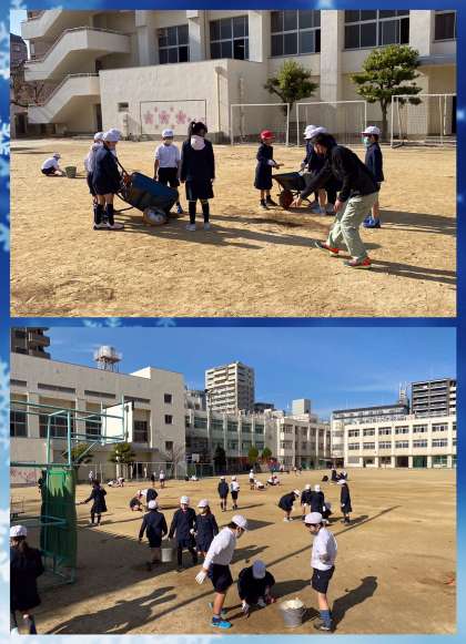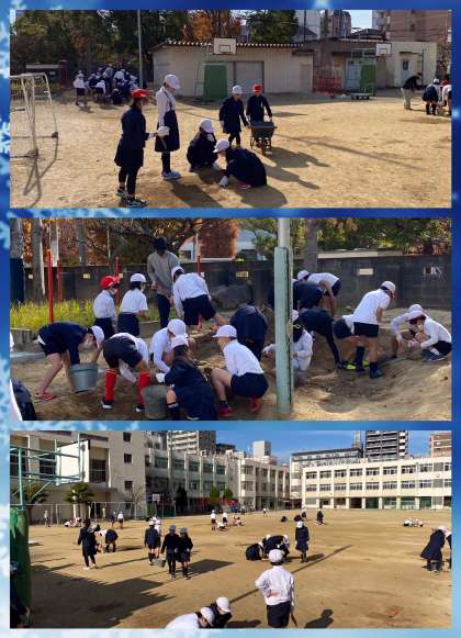デコボコしているところや,石が見えているところなどに土をかぶせました。