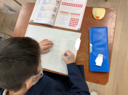 今まで学習した「たし算」「ひき算」「かけ算」を使って24という数を表します。子どもたちはどんな式ができるか、いろいろな発想をしてたくさん式を作っていました。