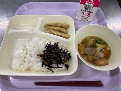 今日の献立・ごはん・牛乳・いわしてんぷら・あつあげと野菜の煮もの・ごまひじきでした。