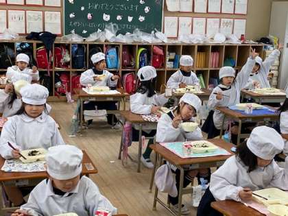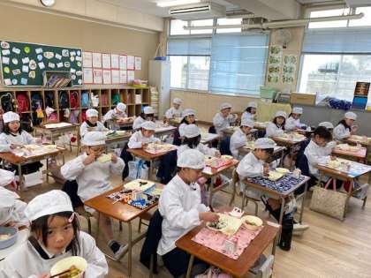 1年生の給食時間の様子です。新型コロナ感染拡大防止により、みんな前向きで食べます。給食放送をよく聞いて、毎日の「給食クイズ」も楽しみにしています。給食当番もみんなで協力して上手になりました。