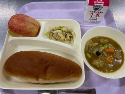 今日の献立は・ミートボールと野菜のカレー煮・ツナとキャベツのソテー・りんご・黒糖パン・牛乳でした。