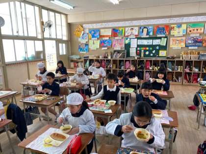みんなの大好きなカレーを使った煮ものには、ミートボールの他に冬が旬のおいしい野菜がたくさん入っていました。苦手な野菜もカレー味にすると食べやすくなり、子ども達にも大人気でした。お家でもぜひ作って欲しいおすすめの献立です。