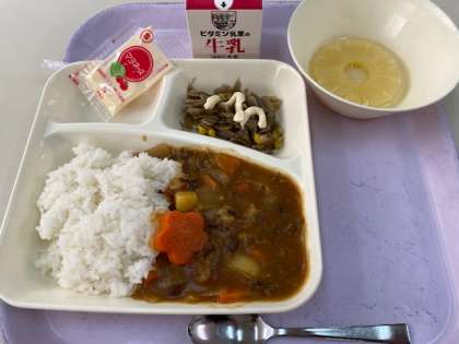 今日の献立は、・牛肉と金時豆のカレーライス(近江牛)・ごぼうサラダ・パインアップル(缶)・牛乳でした。