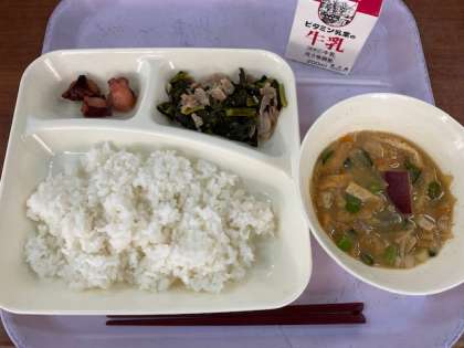 今日の献立は、泉だこのやわらか煮・みそ汁・こまつなの煮びたしでした。