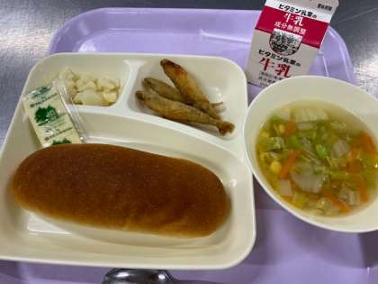 今日の献立・わかさぎフライ・はくさいのスープ・カリフラワーのサラダ・黒糖パン・牛乳でした。
