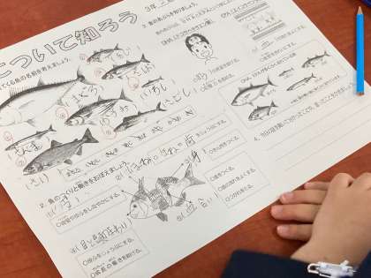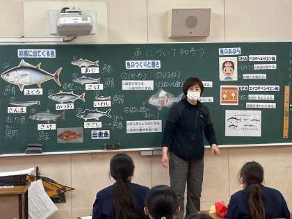 5時間目、6時間目は、今日の給食でも登場した「魚について知ろう」の食育授業を3年生で行いました。給食に登場する魚あてクイズでは、少し難しそうでしたが、魚の漢字や名前の由来を説明するとみんな興味深く聞いていました。その後、「魚のつくりと働き」や「魚のあぶらであるDHA(ドコサヘキサエン酸)、EPA(エイコサペンタエン酸)の働き」を学習することができました。「魚には体に良いえいようがたくさんあることがわかった」「お肉ばかり食べていたけど魚も食べようと思った」など感想を聞くことができました。 2月、給食の魚献立は、節分の行事献立の「いわし」をはじめ、今日の「わかさぎ」の他に「まぐろ」、「きびなご」、「赤魚」が登場します。お楽しみに!