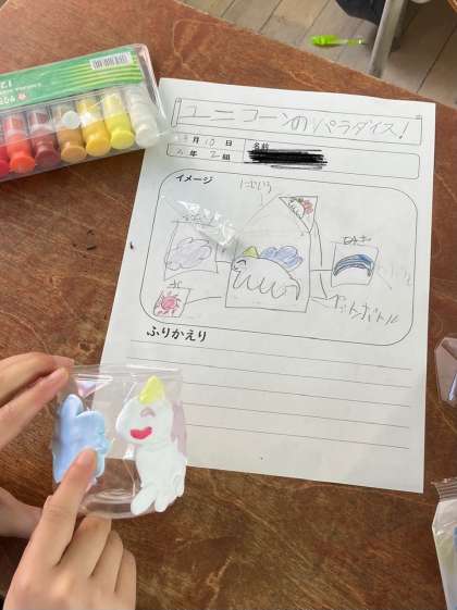 ペットボトルや牛乳パックで作った土台に、絵の具を混ぜて作った色つきのねん土を貼っていきました。