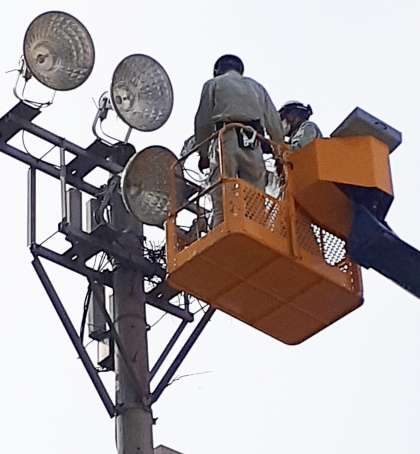 夜間照明灯にカラスが巣を作っていました。本日(3月15日)の午前中に、高所作業車にて業者の方にカラスの巣を撤去してもらいました。カラスの卵が、まだなくて良かったです。