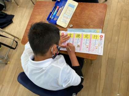 教室へ行ってみて、驚きました。みんな、とても集中して漢字の学習をしていました。指でなぞりながら書き順を確認をしたり、手本を見て一画一画ゆっくりと書いたりと、がんばっていましたね。みんな、とてもていねいな字が書けていました。この調子でしっかり覚えていきましょう。