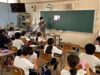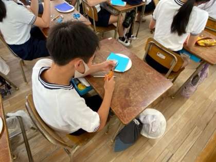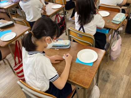 5年生の教室では、歯科検診と体重測定の順番を待っている時間に、折り紙と紙皿を使って何かを作っていましたよ。何が完成するのですかね?