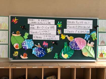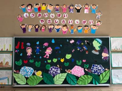 子どもたちが折り紙で折った、小さな花を集めてアジサイを作りました。周りには雨を降らせて、その中を行く子どもたちや、雨を喜ぶ生き物たちを飾りました。雨が降ると外で遊べなくてつまらないこともありますが、雨でも友だちと楽しく過ごせるといいですね。