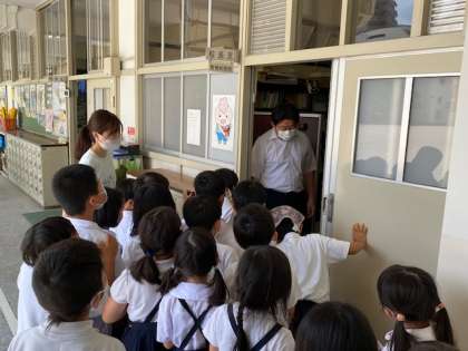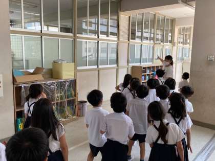今日は学校たんけんをしました。校長室や図工室など特別教室を見て回りました。校長室前には、校長先生がいらっしゃって、校長室のに置いてあるものや、何をするところかなどを教えてくれました。学年があがっていったら今日見たような特別教室でも勉強をしますよ。楽しみですね。