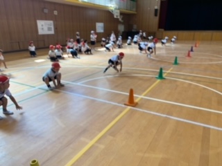 まっすぐ走ったり、コーンをくるっと1周まわったり、生き物の動きを真似しながら走ったりしています。
