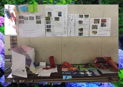 1組と2組の間に置いてある長机に,係活動作品コーナーを設けています。
