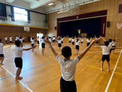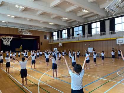 団体演技の練習をしています。5年生の演技の大切なポイントは「静」と「動」です。動いているときだけではなく、動いていないときにそろっているとかっこよく見えますね。気持ちを合わせてがんばりましょう。