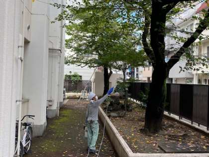 秋になり「イラガ」という毛虫が木につく時期になってきました。そこでたくさんの発生を抑えるために、薬剤散布をしました。イラガに刺されると大変痛いです。みなさんも、触れてしまわないように気をつけてください。